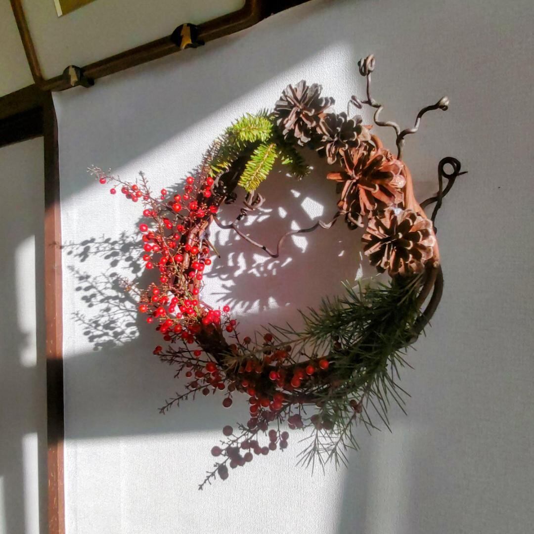 飾りには サンキライ、マツボックリの実 をふんだんにあしらっています。
